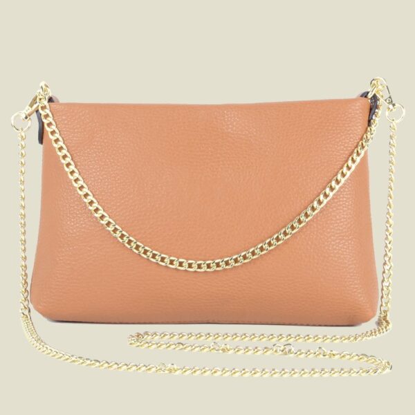 Mooie lederen schoudertas met een gouden ketting detail aan de voorkant.