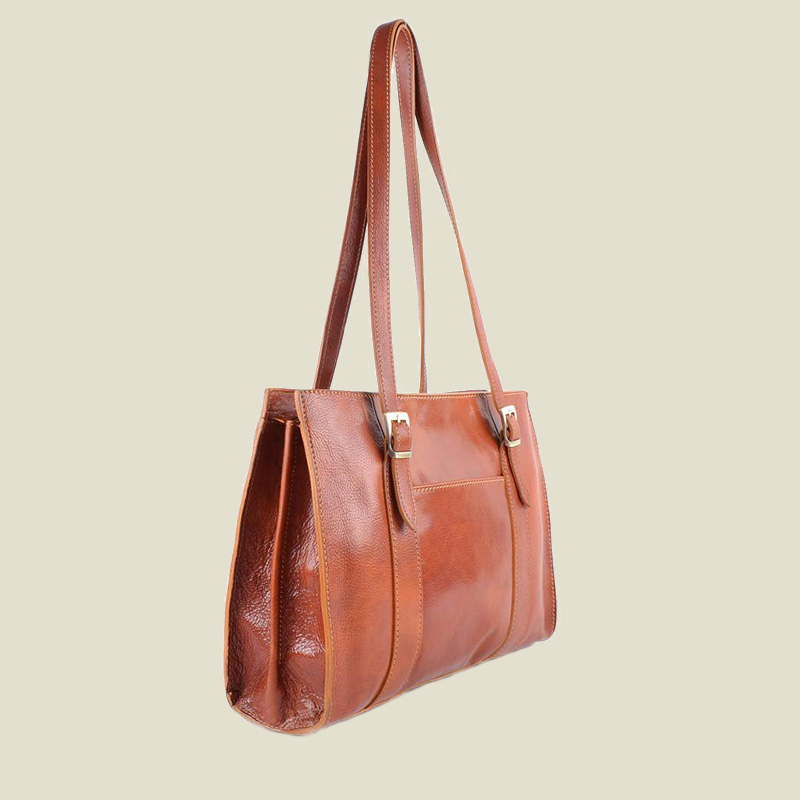 Stevige lederen handtas die sluit met een rits. Binnenin de tas zijn drie vakken, waarvan de middelste met rits. De tas heeft een lang handvat en op de voorzijde zit nog een klein vakje zonder sluiting,